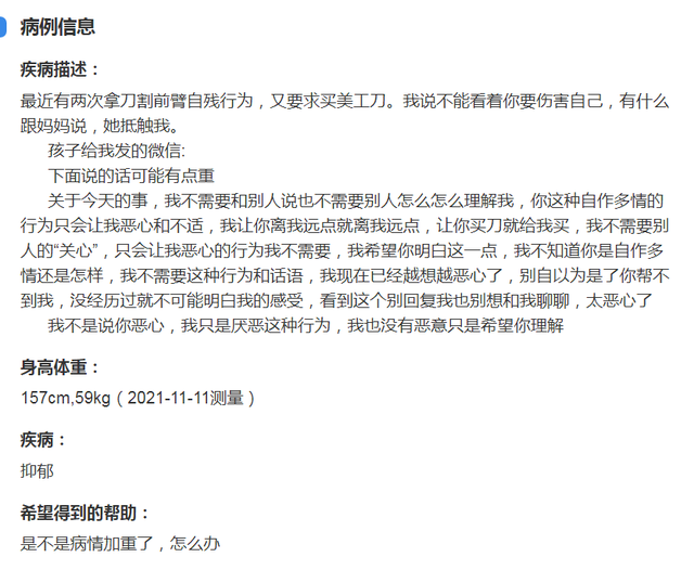 当着医生的面,叶欣欣哭着控诉坐在一旁的父母不关心自己。她感觉心情很差,很孤独。每难过一次,她就用刀割自己一次。问诊及评估结果显示,叶欣欣得了抑郁症。