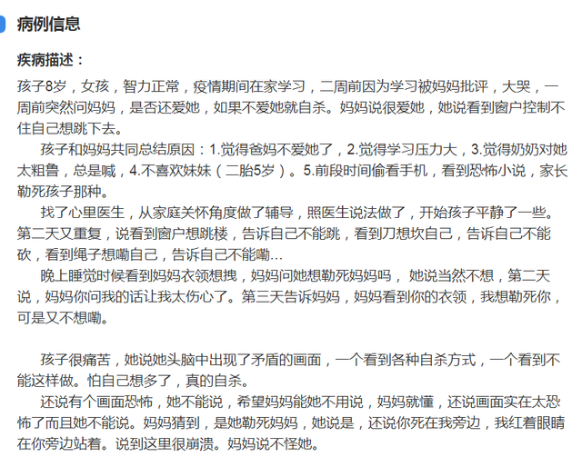 但这些行为表现对应的不一定是特定的疾病。例如,同样是厌学这件事情,既有可能单纯只是孩子的一时想法,也有可能是精神疾病的一种表现。而就算真的是遇到了精神问题,也不能单凭这一种表现轻易下判断。患有抑郁症的孩子,可能会因为学习负担而觉得痛苦,从而有厌学情绪。而患有焦虑症的孩子,也有可能因为一想到学习就紧张难受,从而逃避上学。因而更科学的做法是,在线上问诊之外,寻找对应科室的医生进行专业的诊断。