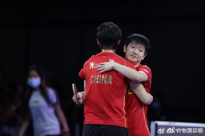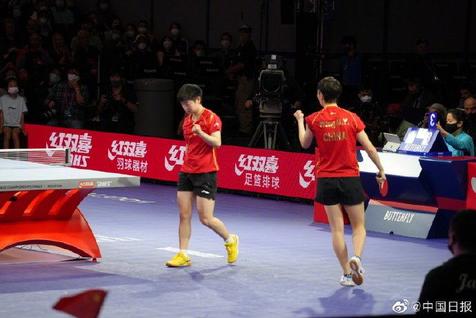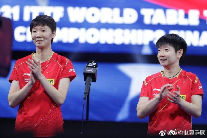 刚刚,在2021休斯敦世乒赛女双决赛上,中国组合孙颖莎/王曼昱以3-0战胜日本组合伊藤美诚/早田希娜,夺得世乒赛女双冠军。