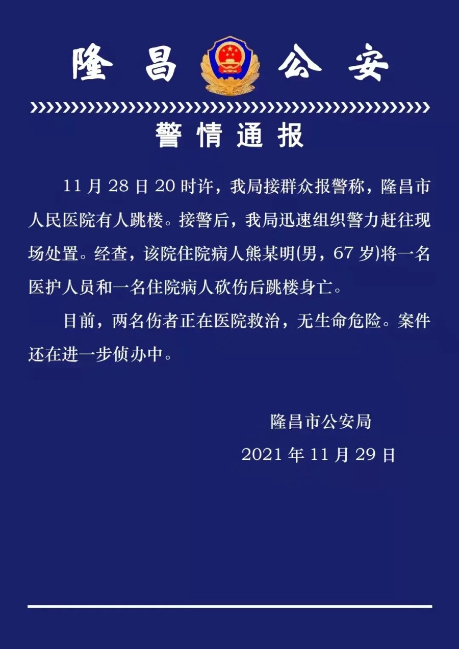 11月29日,四川省隆昌市公安局发布一起警情通报:11月28日20时许,公安局接群众报警称,隆昌市人民医院有人跳楼。接警后,公安局迅速组织警力赶往现场处置。经查,该院住院病人熊某明(男,67岁)将一名医护人员和一名住院病人砍伤后跳楼身亡。目前,两名伤者正在医院救治,无生命危险。案件还在进一步侦办中。记者多方了解到,伤者系行凶者旁边病床的老人和一位护士。