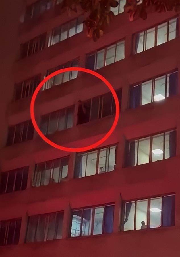现场图片显示,一男子开着窗户站在房屋外向下观望,楼下聚集了很多消防员和警察。