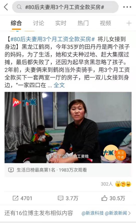 11月1日,微博话题“80后夫妻用3个月工资全款买房”冲上热搜,阅读量超过4亿。