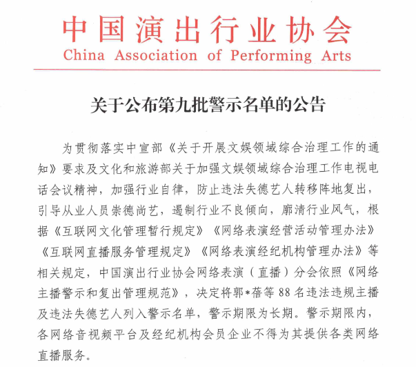 2021年11月,根据文娱领域综合治理有关精神,网络表演(直播)分会发布第九批警示名单,首次对社会影响恶劣的违法失德艺人在网络直播领域进行联合抵制,防止其转移阵地复出。
