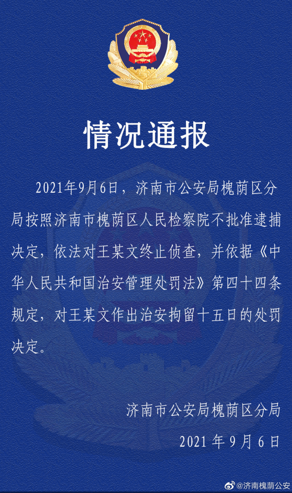 8月14日,济南市公安局槐荫区分局通报,根据《中华人民共和国刑法》第237条规定,犯罪嫌疑人王某文、张某因涉嫌强制猥亵罪,已被济南市公安局槐荫区分局依法采取强制措施,没有证据证明有强奸犯罪事实发生。案件正在进一步侦办中。9月6日,槐荫警方再次通报称,按照槐荫区人民检察院不批准逮捕决定,依法对王某文终止侦查。另一当事人张某则被采取刑事强制措施后被批准逮捕。