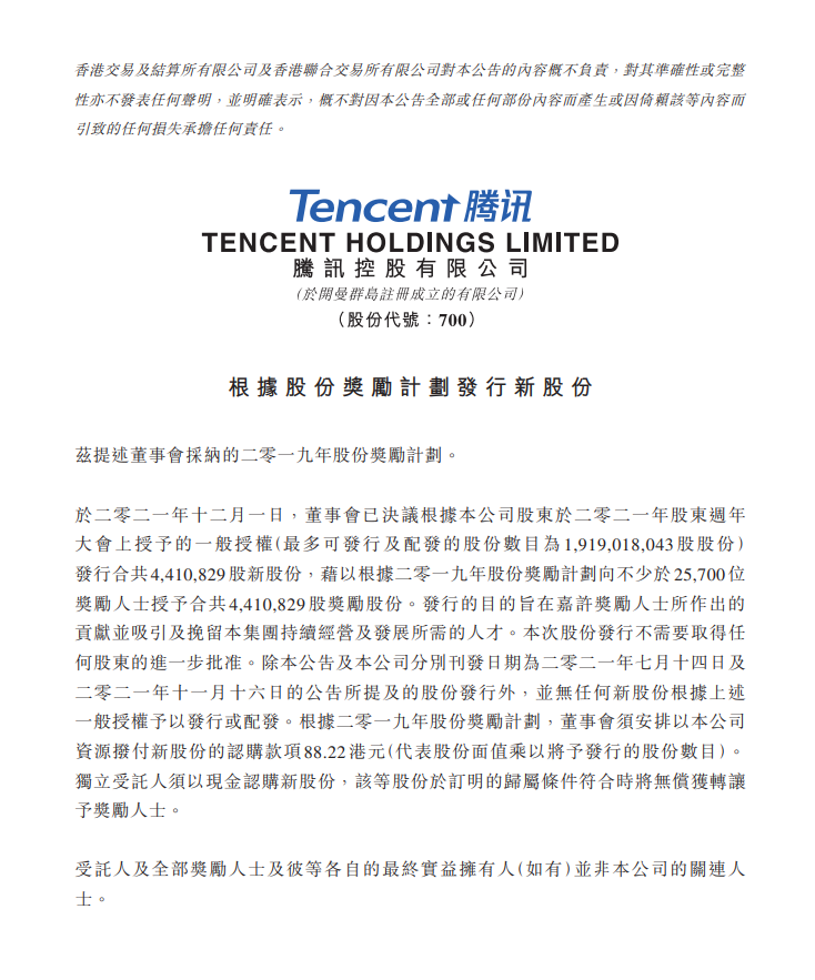 12月1日晚,腾讯控股发布公告,公司董事会已决议向不少于25700位奖励人士授予合共4410829股奖励股份。