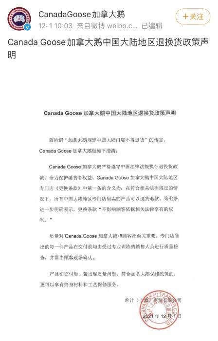仅在数十个小时之后,加拿大鹅自己“打脸”,发布声明否认门店工作人员“线下不能退货”的说法。