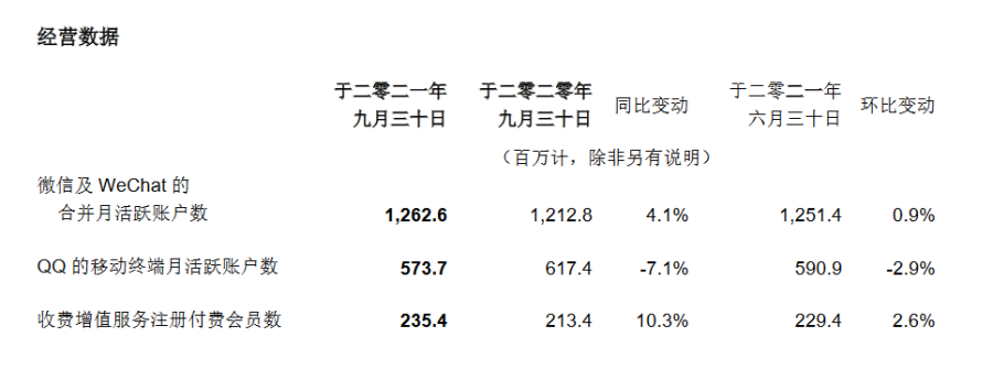 南都记者从腾讯官网获悉,腾讯11月10日发布的2021年第三季度财报显示,微信及WeChat的合并月活跃账户数继续增长,达到12.62亿,同比增长4.1%,环比增长0.9%;QQ的移动终端月活跃账户数为5.73亿,同比下降7.1%,环比下降2.9%。