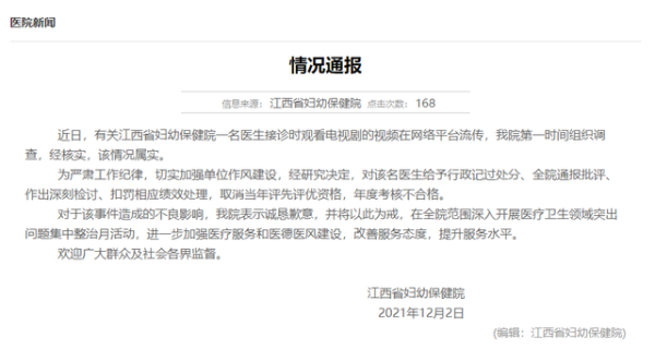 江西省妇幼保健院2日在官方发布情况通报称,近日,有关江西省妇幼保健院一名医生接诊时观看电视剧的视频在网络平台流传,我院第一时间组织调查,经核实,该情况属实。