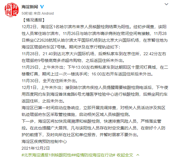 12月2日,海淀区1名来京人员核酸检测结果为阳性。经初步调查,该阳性人员常住哈尔滨市,11月26日与哈尔滨市确诊病例在密闭空间有接触,11月28日乘坐CZ2628航班从哈尔滨太平国际机场到达北京大兴国际机场,在京暂住地为海淀区琨御府东区7号楼。