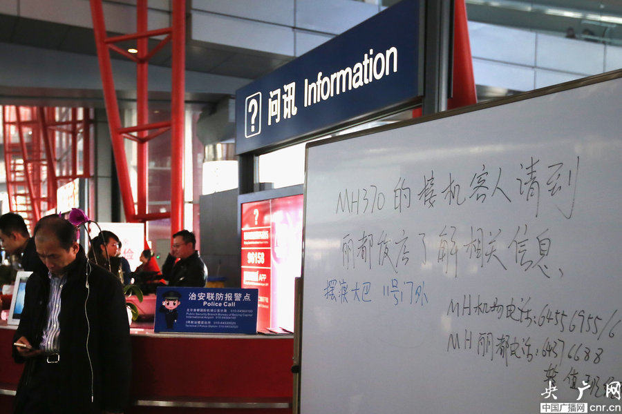2014年3月8日上午8点44,马航官网发布第一份声明:确认北京时间8日2点40分MH370航班与塔台失去联系。接机家属被安排至附近酒店等待相关消息。图据央广网