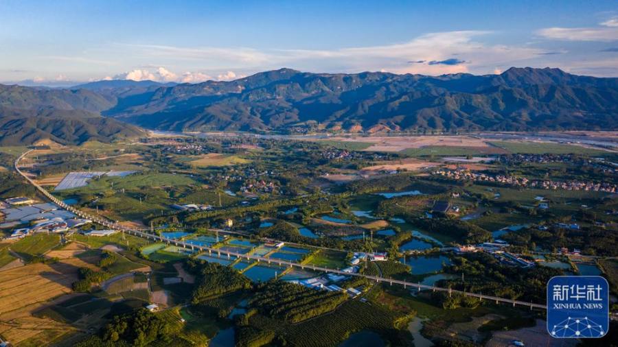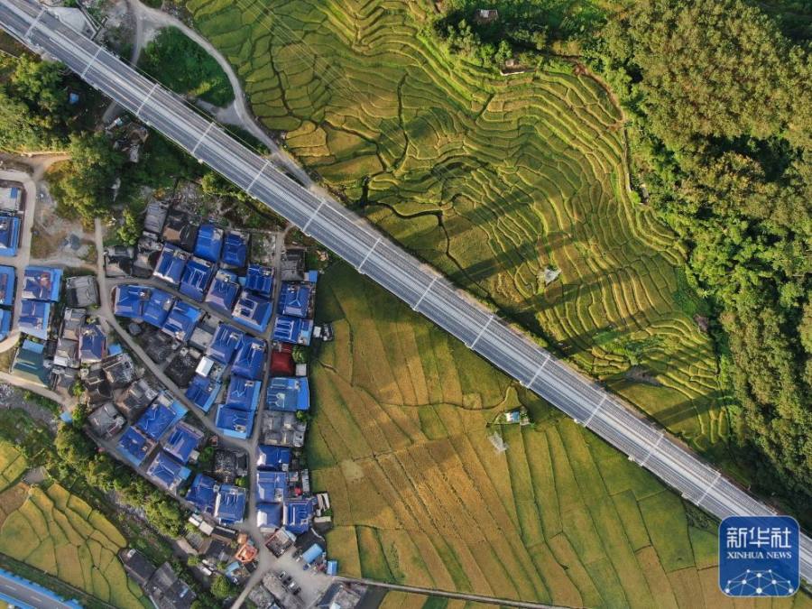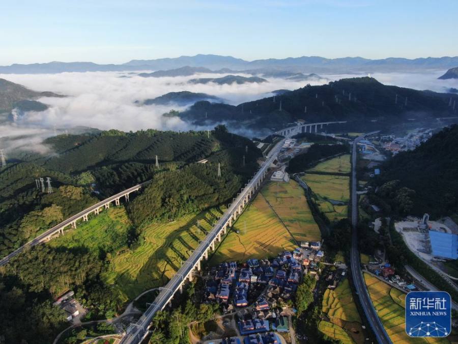 △2021年9月11日在云南西双版纳傣族自治州勐腊县境内拍摄的中老铁路(中)与昆曼大通道。