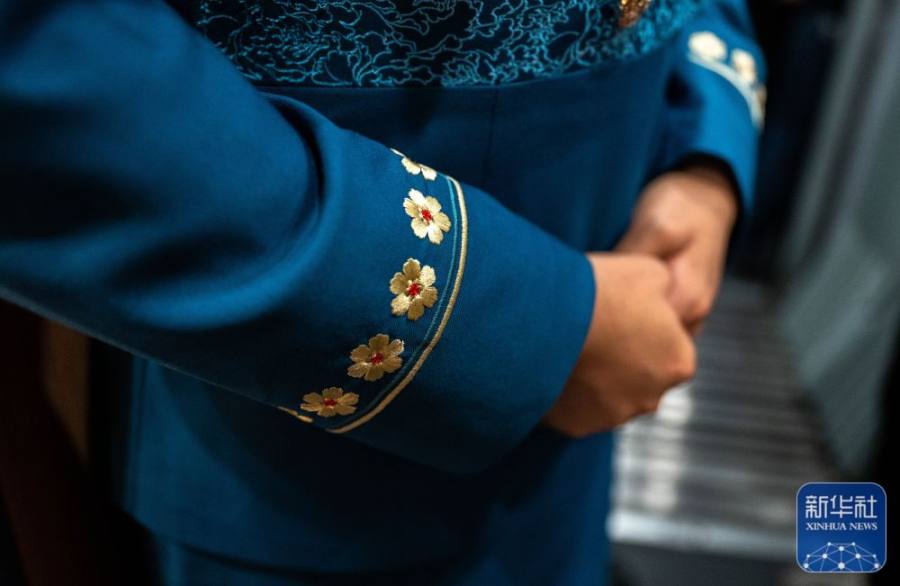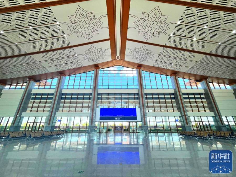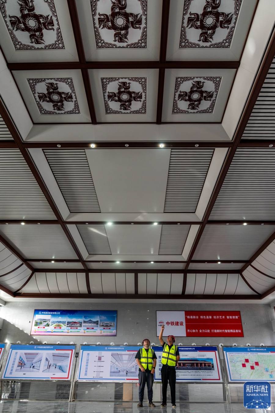 △中老铁路墨江站候车大厅。吊顶中间区域装饰有哈尼族群众喜爱的白鹇鸟环抱太阳的图案。