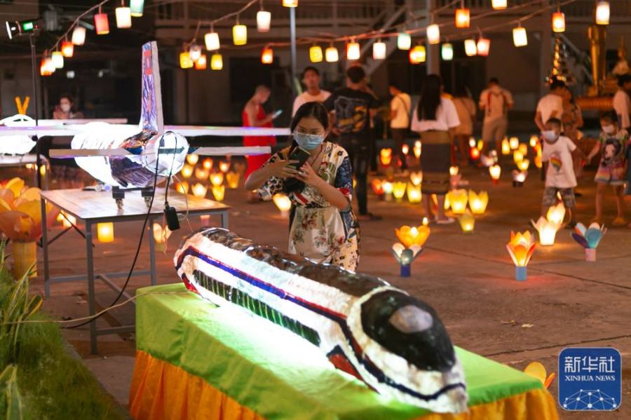 △2021年10月21日,在老挝首都万象,一名女子对着中老铁路“澜沧号”动车组花灯拍照。