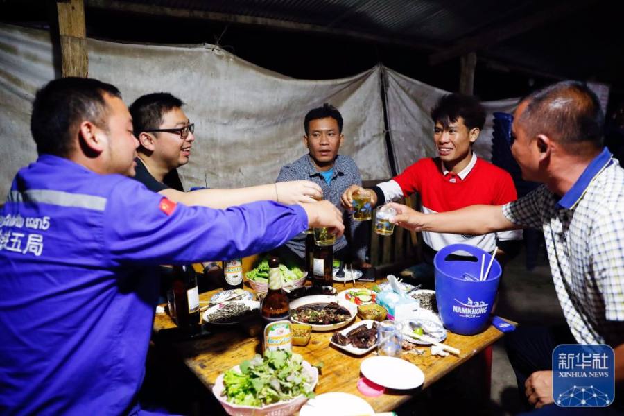 △2019年3月21日,在老挝北部琅南塔省,中铁五局中老铁路一标二分部钢结构加工厂电焊工诺伊·宋玛尼(右二)和中老同事在车间附近喝啤酒吃夜宵。