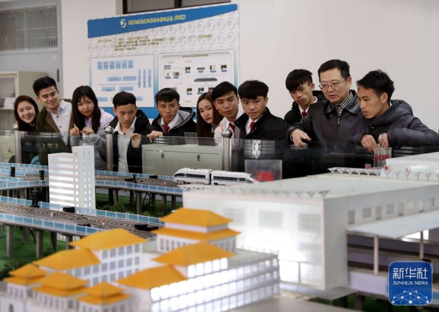 △2019年3月26日,在上海应用技术大学轨道交通学院实验室,院长吴光教授(右二)向老挝留学生们介绍高铁运行线路模型。