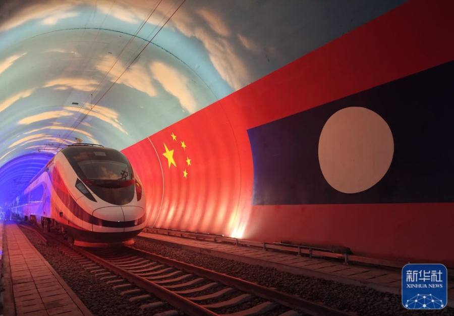△2021年10月15日,“澜沧号”动车组通过中老友谊隧道内的两国边界。