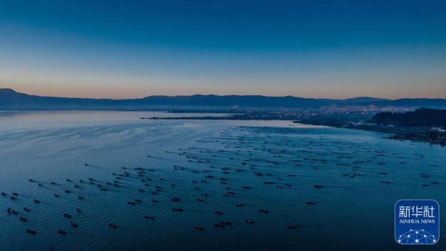 △渔船迎着朝阳浩浩荡荡驶入云南省玉溪市江川县星云湖中。