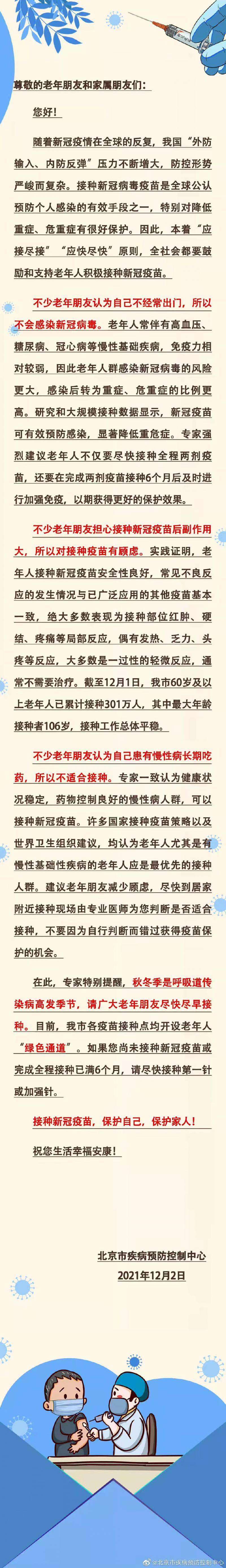 12月2日,北京市疾控中心发布致老年朋友及家属的一封信,其中提到,全社会都要鼓励和支持老年人积极接种新冠疫苗,并提示了老年人接种新冠疫苗的注意事项。