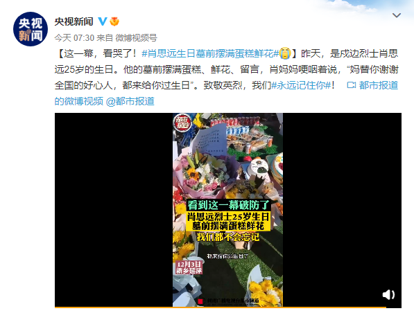昨天,是戍边烈士肖思远25岁的生日。他的墓前摆满蛋糕、鲜花、留言,肖妈妈哽咽着说,“妈替你谢谢全国的好心人,都来给你过生日”。致敬英烈,我们永远记住你!