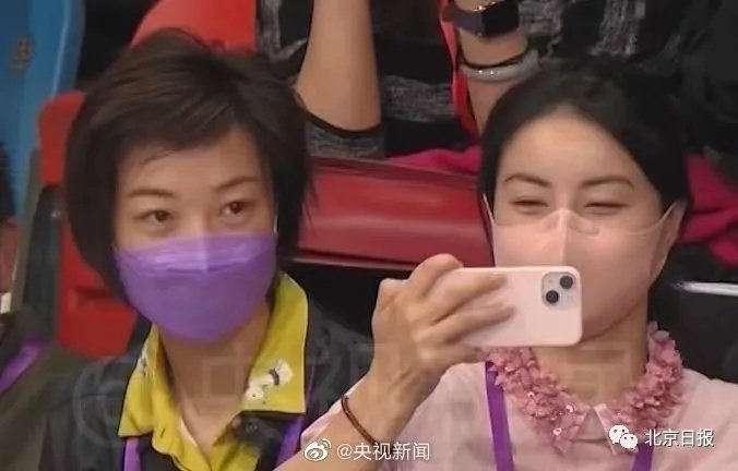 “大魔王”张怡宁和“跳水女皇”郭晶晶并肩坐在观众席上。郭晶晶秒变“迷妹”拍照。