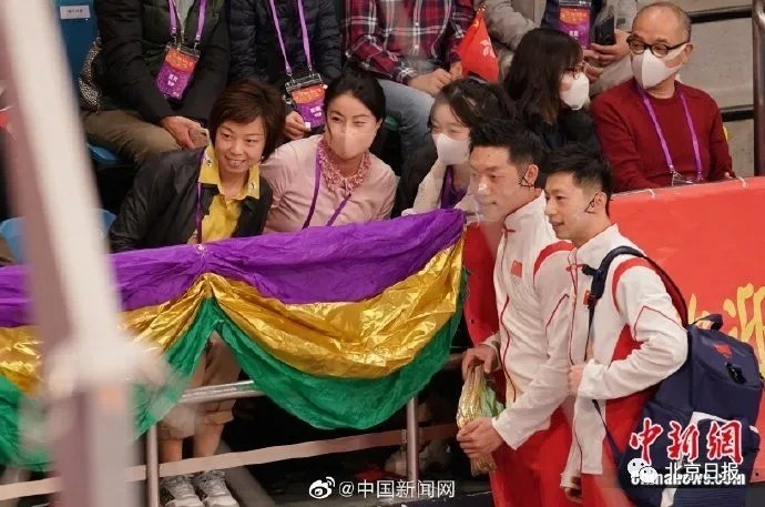 据中新网报道,内地奥运健儿代表团入场后,马龙、许昕前去隔着栏杆与张怡宁和郭晶晶打招呼并合影。