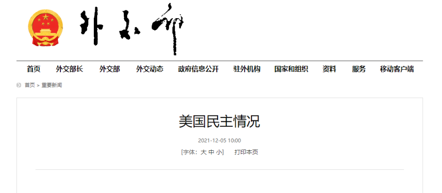 外交部网站5日发布《美国民主情况》报告,通过列举事实、数字和各国相关机构、人士及专家观点,梳理美国民主制度的弊端,分析美国国内民主实践的乱象和对外输出民主的危害,以期美国完善自身民主制度和实践,对外改弦易辙。