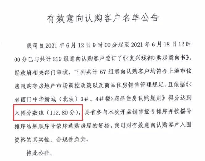 先来看入围分最高的明星楼盘复兴珑御,由于社保年限自2003年1月起计算,因此上限为221个月,要入围只能空白1个月。最终,219组认购(认购率高达466%)者中有67组认购者入围摇号名单。入围分数线达到接近满分的112.8分(满分为113.04)。如果把112.8分还原社保月数,即(112.8-60)÷社保系数0.24=220个月。