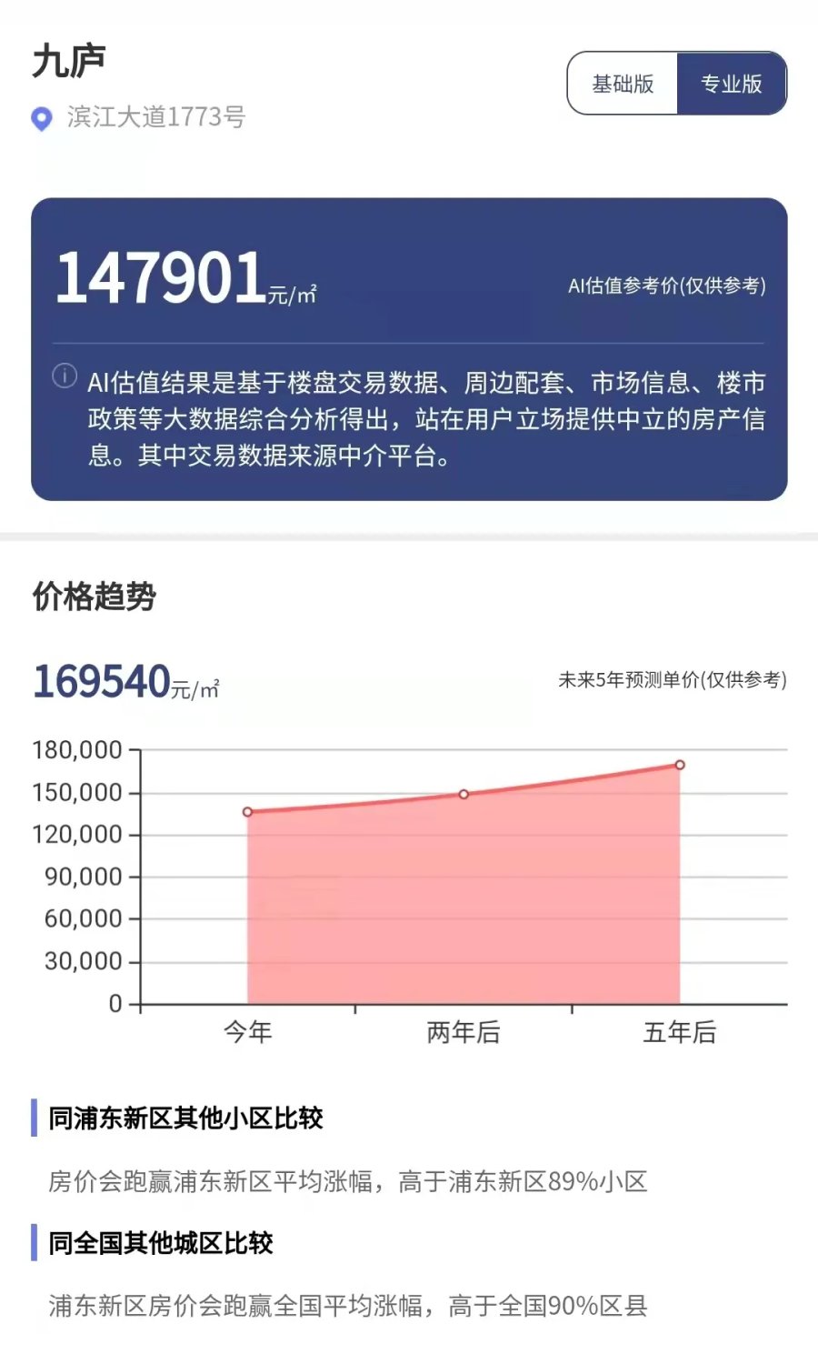数据显示,九庐目前的估值参考价为147901元/平方米,未来5年的价格约为169540元/平方米。