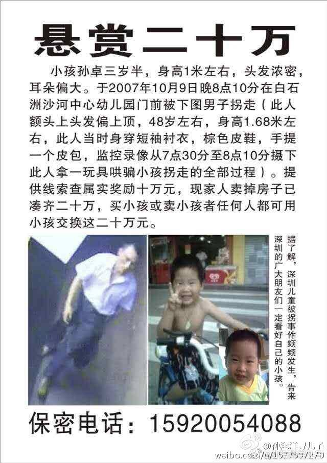 2003年,孙海洋夫妇的孩子孙卓出生,为了给儿子更好的生活,孙海洋带着妻儿去大城市闯荡。2007年10月1日,一家三口来到了深圳白石洲,孙海洋在当地城中村中租了一间店面做包子,儿子被送到隔壁幼儿园学习。然而在10月9日晚,生意结束后孙海洋在屋内打了个盹,等他醒来后,本来在门外玩耍的孙卓不见了。