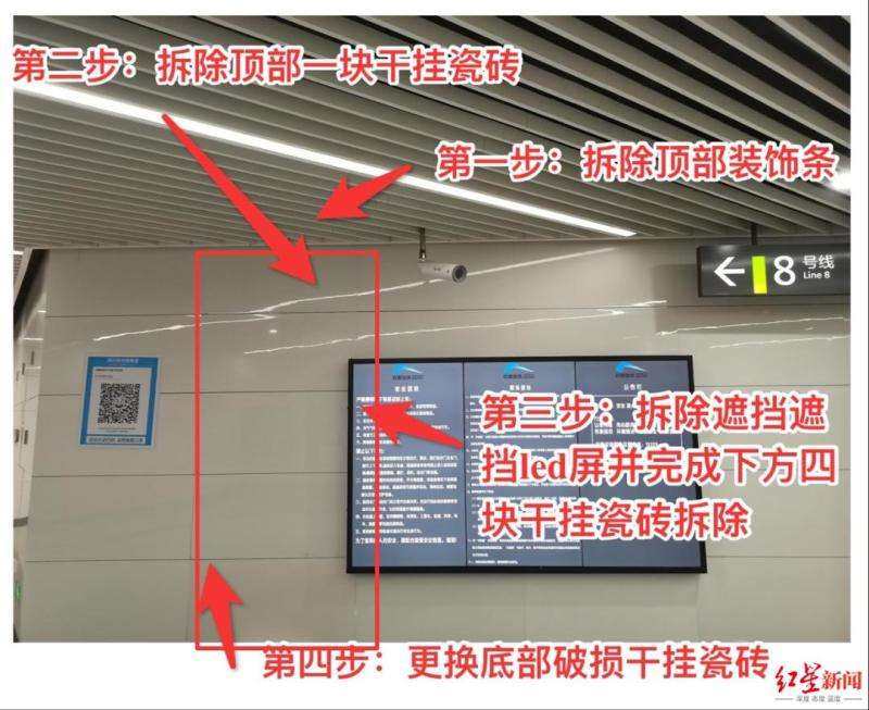 据了解,被撞坏的瓷砖属于干挂瓷砖,又正好位于墙体最下方,欲安装新瓷砖,需先拆除顶部装饰条和上方四块瓷砖。此外,被撞坏的瓷砖附近正巧有一块电子屏幕,只有将屏幕取下才能更换瓷砖。为不影响地铁运行,还必须在23:00—凌晨5:00间施工。正所谓“牵一发而动全身”,维修一块瓷砖需要如此“大动干戈”,人工成本高也就不奇怪了。