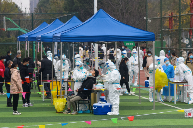 12月8日,在浙江省宁波市镇海区中官路体育公园核酸检测点,人们接受核酸采样。