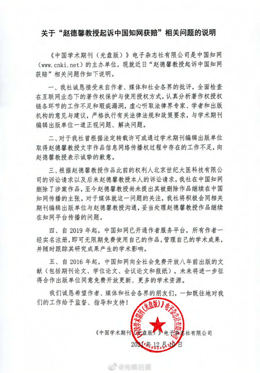 “ CNKI知网”微信公众号12月10日消息,《中国学术期刊(光盘版)》电子杂志社有限公司是中国知网(www.cnki.net)的主办单位,现就近日“赵德馨教授起诉中国知网获赔”相关问题作如下说明。