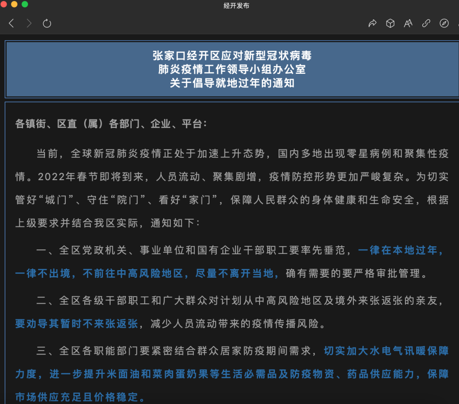 据“经开发布”微信公众号消息,张家口经开区应对新型冠状病毒肺炎疫情工作领导小组办公室发布关于倡导就地过年的通知。