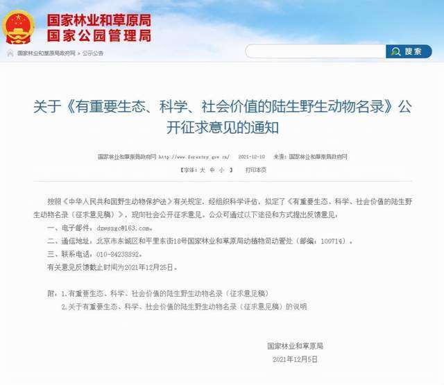 日前,国家林业和草原局发布了《有重要生态、科学、社会价值的陆生野生动物名录(征求意见稿)》,向社会公开征求意见。本次名录调整,以科学评估陆生野生动物物种生态、科学、社会价值为核心,充分考虑种群变化动态、面临威胁、社会关注等多方面因素,提出了名录调整基本原则:一是坚持生态优先;二是维护科研需要;三是有利于社会发展。