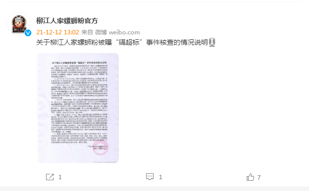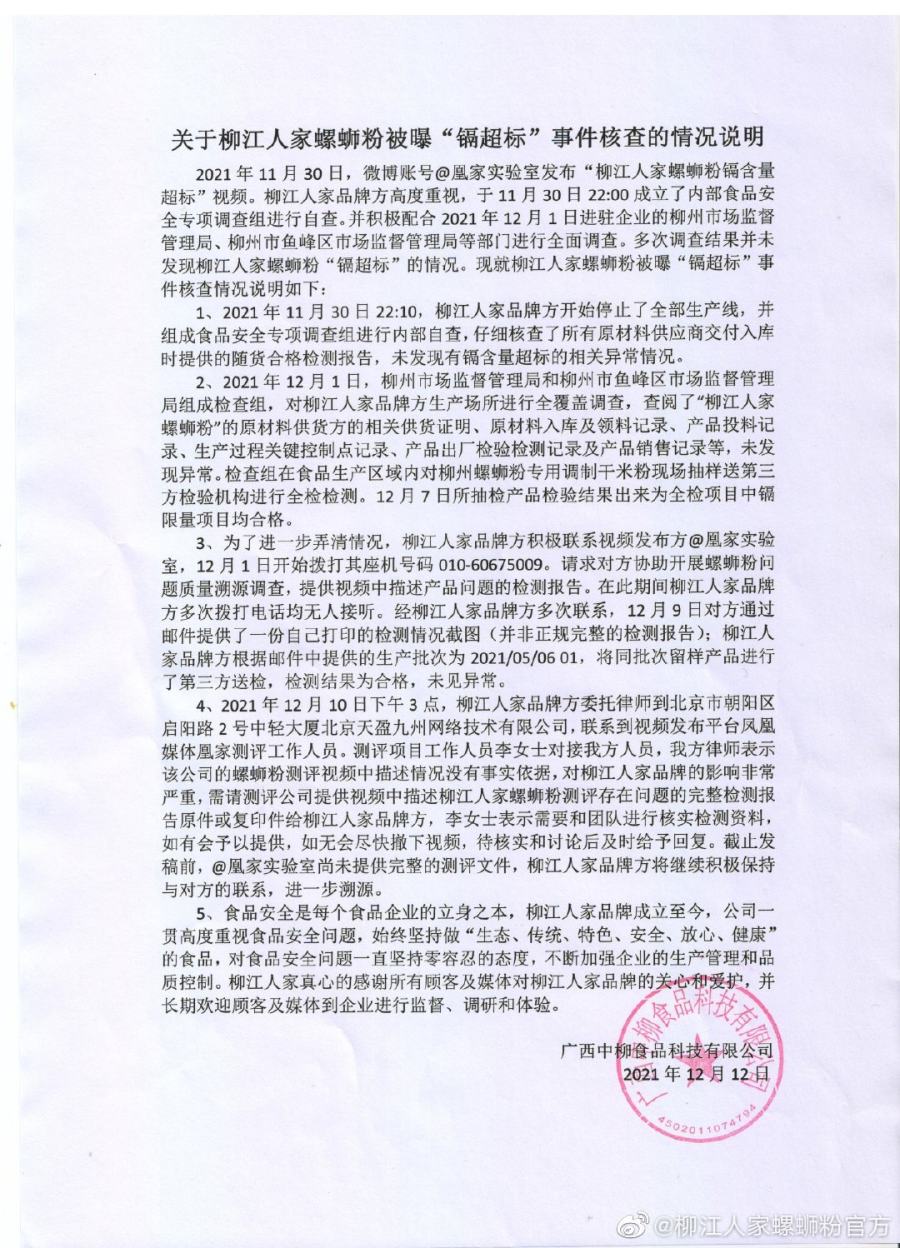 12月12日,柳江人家螺蛳粉官方微博发布声明,回应“螺蛳粉镉超标”事件。