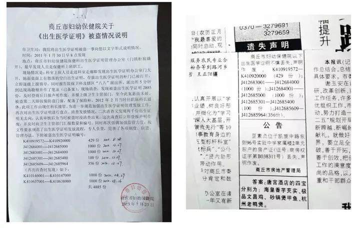 这是一张拼版图片:图左为商丘市妇幼保健院2013年7月23日向商丘市卫生局报告的被盗情况说明,图右为刊登在《商丘日报》上的一批出生医学证明丢失的作废声明。上官正义提供