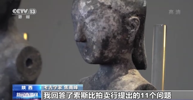 考古学家 焦南峰:在拍卖之前,把这6件陶俑,从拍卖的名单里拿出来了。我受国家文物局委托,我回答了索斯比拍卖行提出的11个问题,为什么说是中国的?为什么说是陕西的?为什么说是西汉的?等等类似问题。