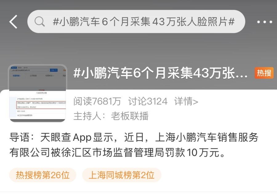 12月14日,小鹏汽车因“6个月内采集43万张顾客人脸照片”而登上微博热搜。