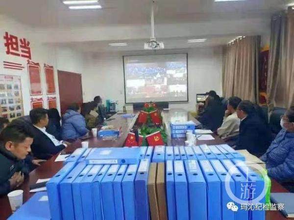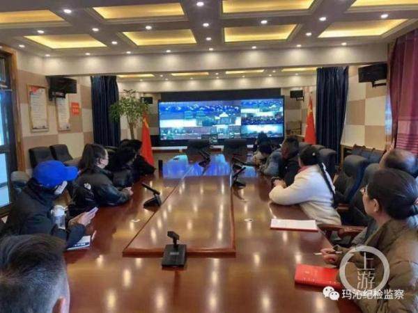 ▲12月8日,玛沁县各政府部门收看格日措、柔智案一审直播。图片来源/玛沁县纪委监委