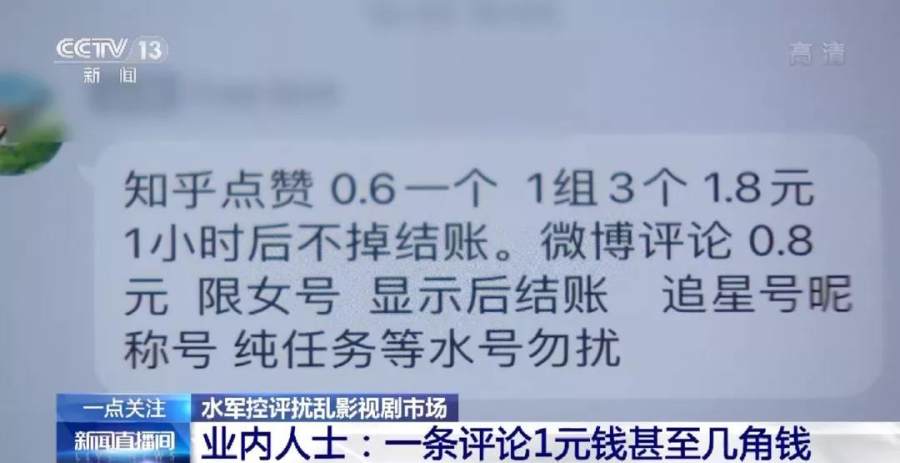 一部古装剧由于某些原因比“官宣”时间晚上线一小时,然而在某知名打分平台有大量评分在原定上线时间集中涌入;而另一部网剧中,女主演尚未登场的前两集播出后,网络平台却涌现了大量质疑其演技、台词的论调和一星短评。报道中提到,网上有一些专门的水军派单群,群里相当活跃,不断有人发布兼职控评的招募信息,一条点评一元钱甚至几角钱。