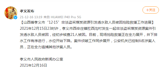 2021年12月15日23时许,孝义市西辛庄镇杜西沟村发生一起非法盗采煤炭资源案件引发透水致人员被困,经初步核查21人被困。目前,现场抢险救援正在全力展开,井下排水工作有序进行,水位开始下降。案件侦破工作同步展开,公安机关已控制6名涉案人员,正在全力追捕其他涉案人员。