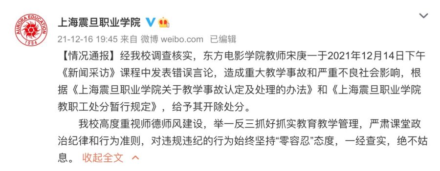 上海震旦职业学院16日晚发微博称:经我校调查核实,东方电影学院教师宋庚一于2021年12月14日下午《新闻采访》课程中发表错误言论,造成重大教学事故和严重不良社会影响,根据《上海震旦职业学院关于教学事故认定及处理的办法》和《上海震旦职业学院教职工处分暂行规定》,给予其开除处分。