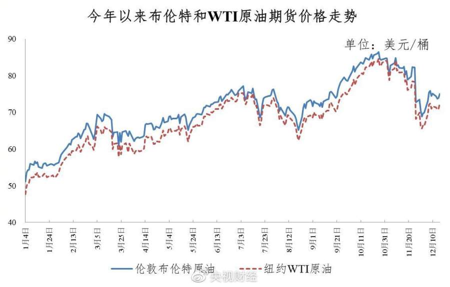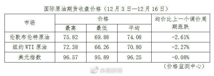 据国家发改委价格监测中心监测,本轮成品油调价周期内(12月3日—12月16日)国际油价震荡运行。平均来看,伦敦布伦特、纽约WTI油价比上轮调价周期下降2.44%。