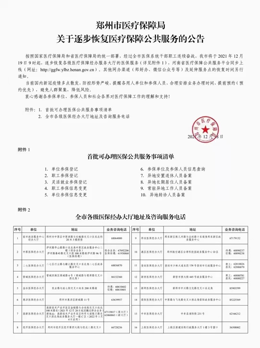 “按照国家医疗保障局和省医疗保障局的统一部署,经过郑州全市医保系统干部职工连续奋战,郑州市将于2021年12月19日9时起,逐步恢复各级医疗保障经办服务大厅的医保服务。”大河报·豫视频记者从郑州市医疗保障局获悉。