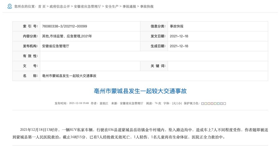 据安徽省应急管理厅网站,12月18日13时许,安徽亳州,一辆SUV私家车辆行驶至036县道蒙城县岳坊镇金牛村境内时,坠入路边沟中,造成车上7人不同程度受伤,伤者随即被送到蒙城县第一人民医院救治。截止16时15分,已有5人经抢救无效死亡,1人重伤,1名儿童尚有生命体征,医院正全力救治中。