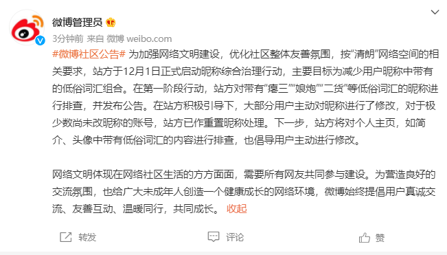 @微博管理员消息,为加强网络文明建设,优化社区整体友善氛围,按“清朗”网络空间的相关要求,站方于12月1日正式启动昵称综合治理行动,主要目标为减少用户昵称中带有的低俗词汇组合。在第一阶段行动,站方对带有“瘪三”“娘炮”“二货”等低俗词汇的昵称进行排查,并发布公告。在站方积极引导下,大部分用户主动对昵称进行了修改,对于极少数尚未改昵称的账号,站方已作重置昵称处理。下一步,站方将对个人主页,如简介、头像中带有低俗词汇的内容进行排查,也倡导用户主动进行修改。