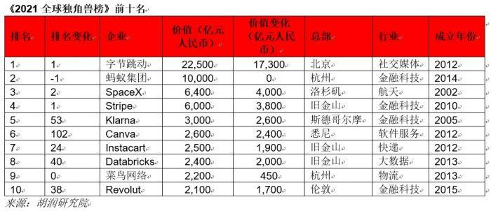 《2021全球独角兽榜》出炉!中国3家企业登上前十