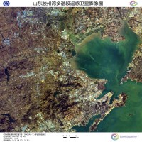 说明:图像右侧为青岛市区(局部),左侧为西海岸新区,胶州湾跨海大桥横跨中间。东北侧的墨水河与西北侧的大沽河注入胶州湾,河水流向清晰可辨。湾内风平浪静,有利于水中的泥质悬浮物沉淀,水体相对清澈;湾外海水流速变大,泥质悬浮物不易沉淀,呈浑浊的浅黄色。