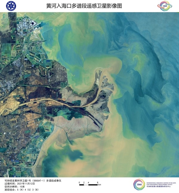 说明:黄河入海口色彩斑斓、层次分明。图像呈现了黄河入海后河水与海水逐步混合,入海泥沙随混合水体运移,逐步消散的过程。