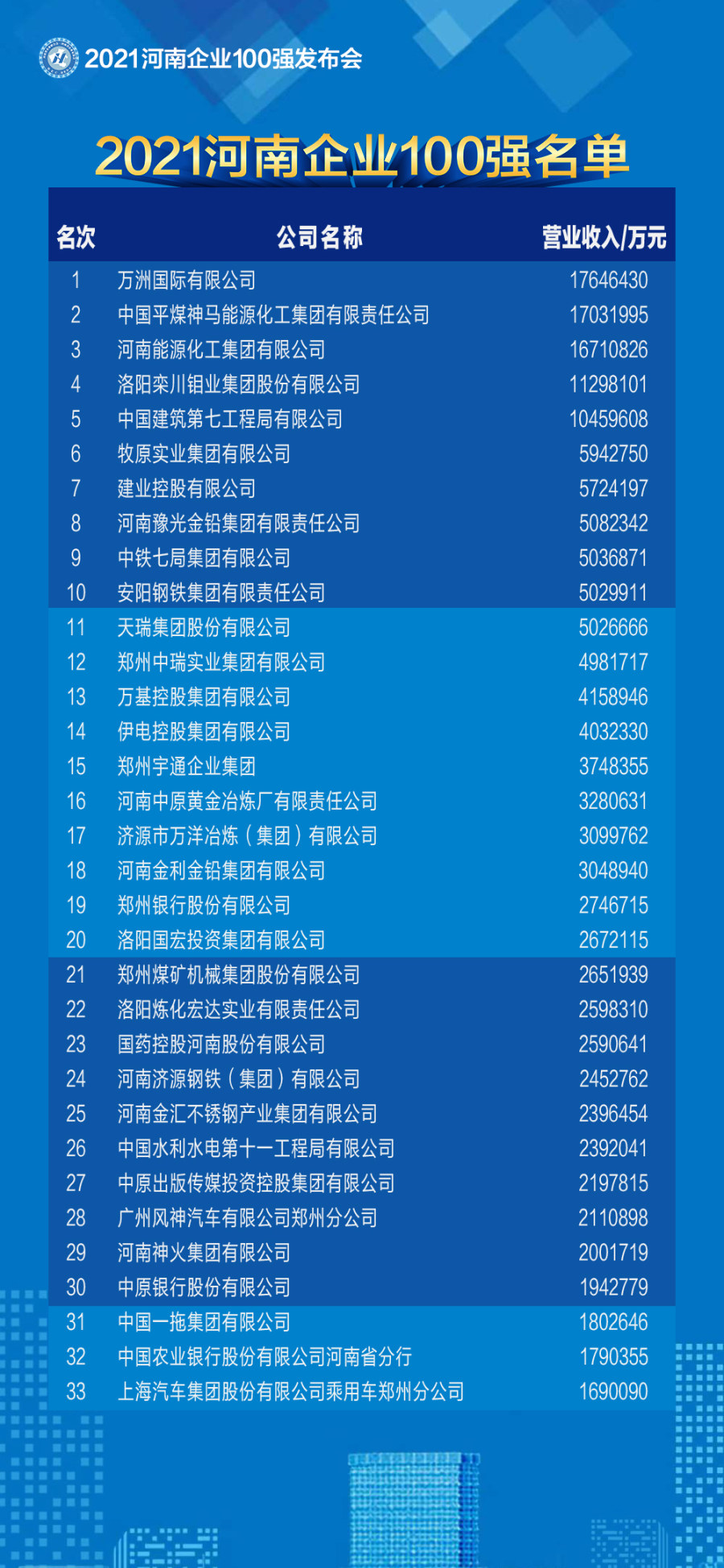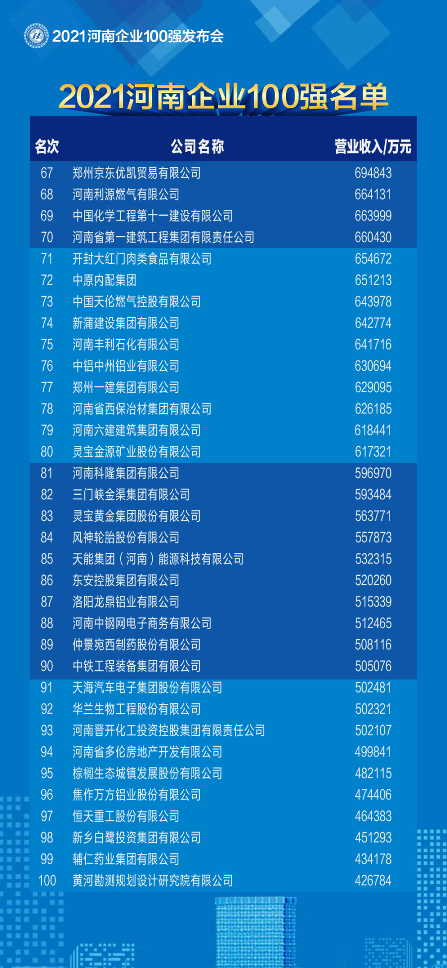 2021河南100强企业榜单发布(附名单)